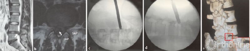 (a)(b)L4/5节段中央型突出的矢状位和横断位;(c)(d)环锯放置X线透视图;(e)术后腰椎CT三维重建图,红色方框示切除上关节突骨质范围;↖指突出椎间盘,IAP指下关节突,SAP指上关节突