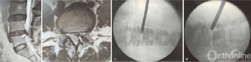 (a)(b)L4/5节段后外侧区突出的矢状位和横断位;(c)(d)工作通道放置X线透视图;↖指突出椎间盘,IAP指下关节突,SAP指上关节突