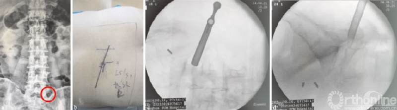 (a)腰椎正位X线片示左侧横突粗大;(b)穿刺点距离及穿刺方向规划图;(c)(d)工作通道放置X线透视图;○指狭小的工作通道空间