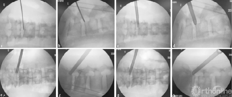 (a)(b)L4/5节段向上游离型突出穿刺置管透视图,其中(a-b)为一级导杆定位图;(c)(d)工作通道放置图;(e-h)L4/5节段向下游离型突出穿刺置管透视图,其中(e-f)为保护套管下环锯行FP图;(g)(h)工作通道放置图