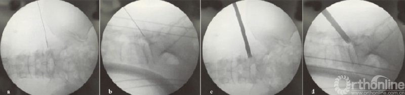 (a)(b)L5S1穿刺置管透视图,其中(a-b)为穿刺导针定位图,(c)(d)保护套管下环锯行FP图;图中可见L5S1阶段椎间孔相对狭小,且有高髂棘、大横突存在