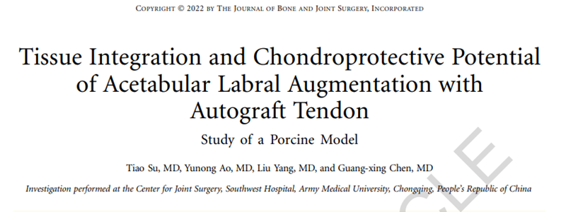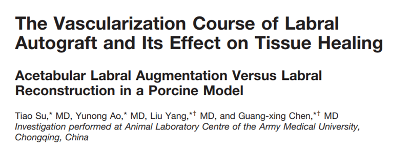 相关论文题为“The Vascularization Course of Labral Autograft and Its Effect on Tissue Healing: Acetabular Labral Augmentation Versus Labral Reconstruction in a Porcine Model”,已在American Journal of Sports Medicine上发表;“Tissue Integration and Chondroprotective Potential of Acetabular Labral Augmentation with Autograft Tendon: Study of a Porcine Model”, 已在The Journal of Bone and Joint Surgery-American volume上发表。第一作者均为苏眺医师,杨柳、陈光兴主任医师为通讯作者。