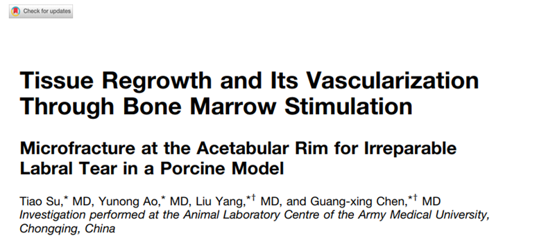 相关论文题为“Tissue Regrowth and Its Vascularization Through Bone Marrow Stimulation Microfracture at the Acetabular Rim for Irreparable Labral Tear in a Porcine Model”,已在American Journal of Sports Medicine上发表。第一作者均为苏眺医师,杨柳、陈光兴主任医师为通讯作者。