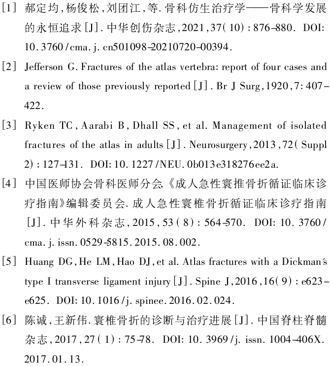 其次,部分学者对采用单椎节内固定治疗合并横韧带损伤的寰椎骨折仍存有争议,其焦点主要在于如何判断寰椎横韧带损伤以及侧块撕脱对寰枢椎稳定性的影响程度[6]。未来可通过生物力学研究确定寰椎横韧带损伤以及侧块撕脱需固定融合的界值。