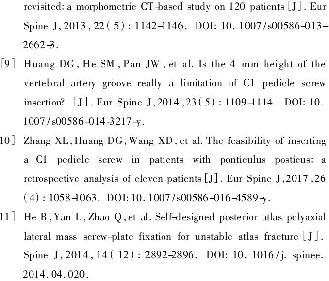 首先,虽然仿生自然治疗对于大部分寰椎骨折患者效果可靠,但对严重寰椎骨折脱位患者,无论前路还是单纯后路手术均难以完全实现解剖学复位,导致术后残余颈枕部疼痛。甚至对少数病例不得不采用寰枢融合固定或颈枕融合固定手术,牺牲上颈椎的活动功能。因此,有待研发更加理想的复位内固定器械,以提升寰椎骨折仿生自然治疗的效果。