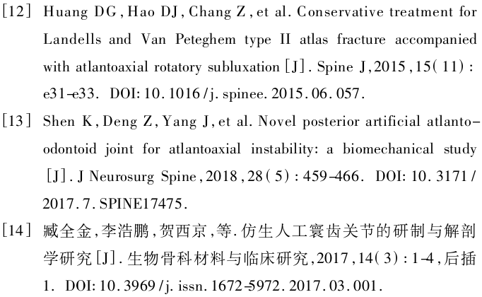 最后,针对因陈旧性寰椎骨折脱位合并顽固性颈枕疼痛使生活质量受到严重影响的患者,通过将医学和工程学等学科深度融合研发人工寰枢关节,实现伤后寰枢椎功能与结构的生理重塑,即仿生替代治疗[13-14]。