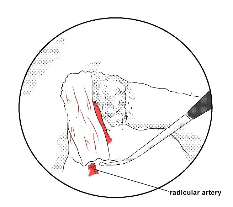 5. 切除黄韧带后显露出出口根,使用等离子刀头对出口根周围的根动脉进行预止血。