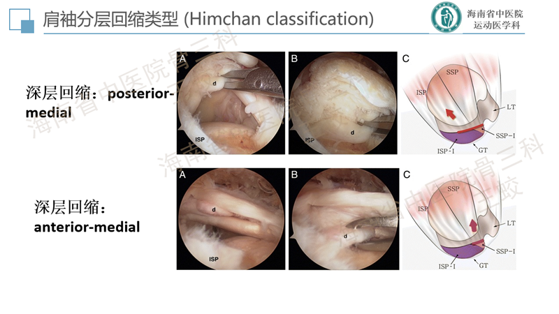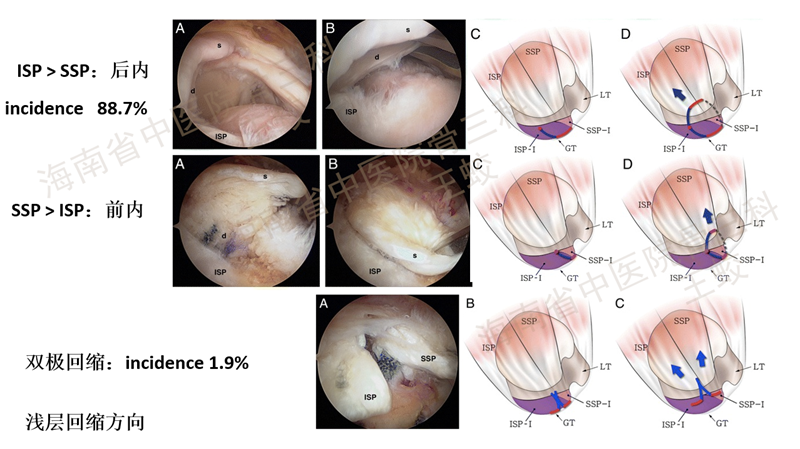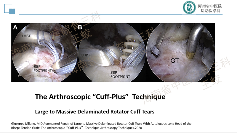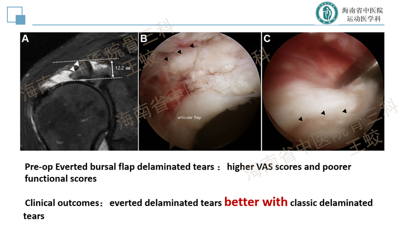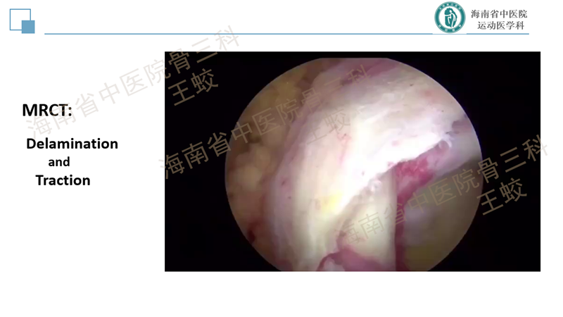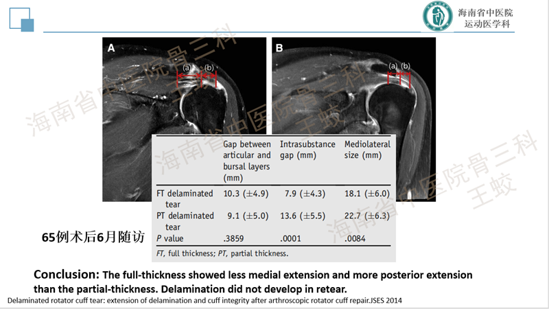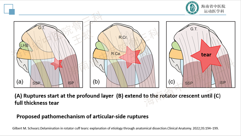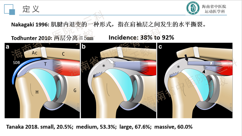 肩袖分层撕裂是肩袖的一种慢性退变性疾病,类似于膝关节内侧半月板后角的退变性层裂,患者往往肩痛症状较重,持续时间较长,预后较差。目前发病机制尚不十分明确,研究较少。缝合方法也没有达成共识,恢复肩袖的完整性,保持层间的张力是临床上需要重点关注的问题。