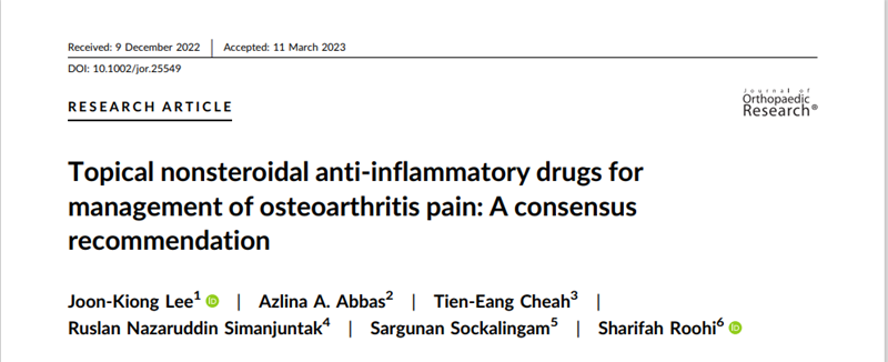 Lee JK, Abbas AA, Cheah TE, Simanjuntak RN, Sockalingam S, Roohi S. Topical nonsteroidal anti-inflammatory drugs for management of osteoarthritis pain: A consensus recommendation. J Orthop Res. 2023 Mar 16. doi: 10.1002/jor.25549.Epub ahead of print.PMID: 36924071.