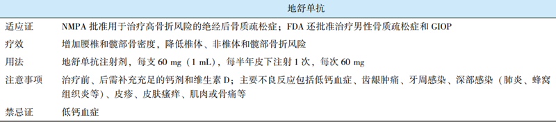 地舒单抗总体安全性良好,长期应用略增加ONJ或AFF的发生风险。同时,应注意地舒单抗为短效作用药物,不存在药物假期,一旦停用,需要序贯双膦酸盐类或其他药物,以防止骨密度下降或骨折风险增加。