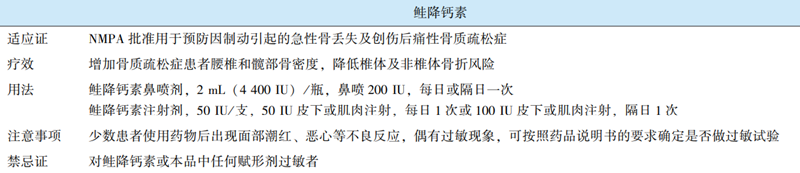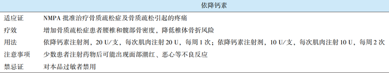降钙素是一种钙调节激素,能抑制破骨细胞的生物活性、减少破骨细胞数量,减少骨量丢失并增加骨量。降钙素的另一作用是能有效缓解骨痛。目前应用于临床的降钙素制剂有两种:鳗鱼降钙素类似物依降钙素、鲑降钙素。