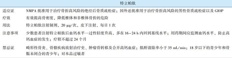 甲状旁腺激素类似物(PTHa)是促骨形成药物,国内已上市的特立帕肽是重组人甲状旁腺激素氨基端1⁃34片段(rhPTH1⁃34)。间断使用小剂量PTHa能刺激成骨细胞活性,促进骨形成、增加骨密度、改善骨质量、降低椎体和非椎体骨折风险。