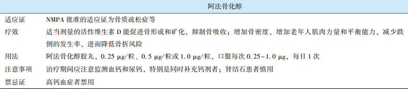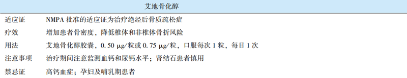 目前国内上市治疗骨质疏松症的活性维生素D及其类似物有阿法骨化醇(1α羟维生素D)、骨化三醇(1,25双羟维生素D)及艾地骨化醇(ELD),艾地骨化醇为新型活性维生素D衍生物,在1,25(OH)2D化学结构2β位引入3羟基丙氧基。上述药物因不需要肾脏1α羟化酶羟化即可发挥生理活性,故称为活性维生素D及其类似物。此类药物更适用于老年人、肾功能减退及1α羟化酶缺乏或减少的患者,具有提高骨密度、减少跌倒、降低骨折风险的作用。
