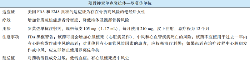 罗莫佐单抗是硬骨抑素单克隆抗体,通过抑制硬骨抑素的活性,拮抗其对骨代谢的负向调节作用,在促进骨形成的同时抑制骨吸收。已经在其他国家或地区上市使用,国内正在进行Ⅲ期临床试验,预先纳入本指南,临床使用需待该药在我国获得防治骨质疏松症的适应证。