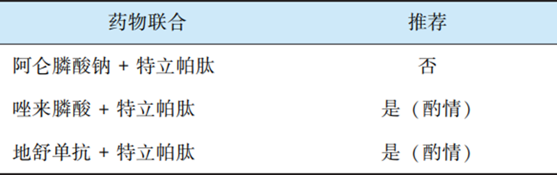 阿仑膦酸钠与特立帕肽联合治疗绝经后骨质疏松症患者,并未获得较特立帕肽单药治疗更多获益,不建议这两类药物联合使用。