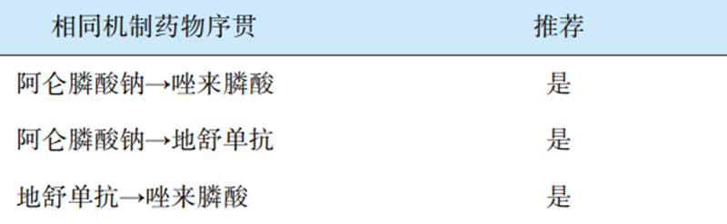 ①口服阿仑膦酸钠序贯唑来膦酸或者地舒单抗治疗,均可有效增加腰椎和全髋部骨密度;地舒单抗增加骨密度作用更明显,但无降低骨折风险的对比数据。此种序贯方式建议酌情用于口服双膦酸盐类药物无法耐受或者效果不佳的高骨折或极高骨折风险患者。