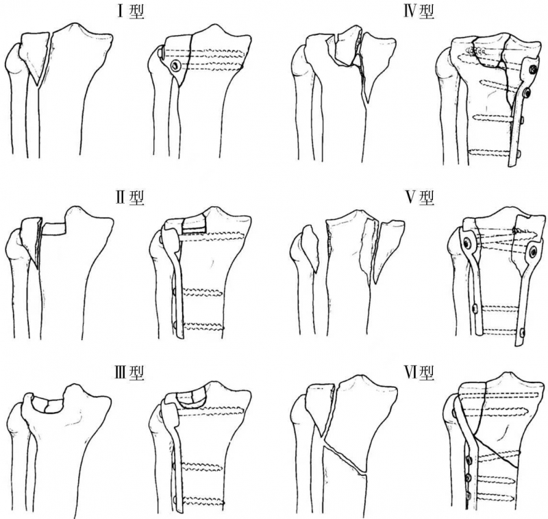⑤Ⅵ型(伴有干骺端与骨干分离的平台骨折):除单髁或双髁及关节面骨折外,还存在胫骨近端横形或斜形骨折。由于骨干和干骺端分离,使该型骨折不适合采用牵引治疗,大部分应用支撑钢板及骨松质螺丝钉治疗。如果双髁均有骨折,每一侧均应上钢板固定。最近,提倡用钢针及钢丝固定治疗这些难以处理的骨折。