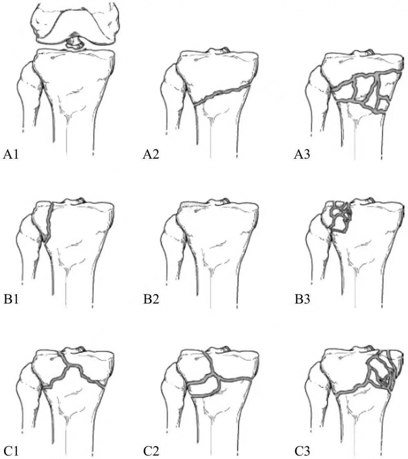 图2 胫骨平台骨折的AO分型示意
