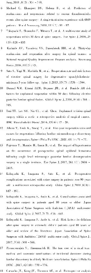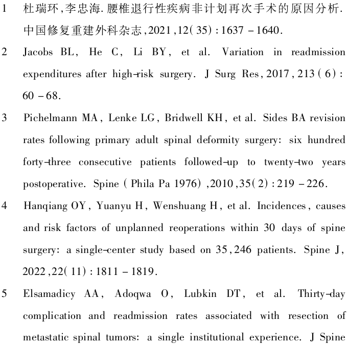 Elsamadicy等[5]研究30例与转移性脊柱肿瘤切除相关的30d并发症和计划外再入院率,30d再入院率为9.7%。Michael等[6]回顾性分析6869例连续脊柱手术记录,一半以上的再手术发生在腰椎(67.52%),25.83%发生在颈椎,5.78%发生在胸椎,0.89%没有报道确切的手术部位。