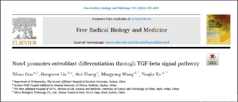 2022年11月该刊发表了“Nox4 promotes osteoblast differentiation through TGF-beta signal pathway”原创研究论文;2023年2月该刊又发表了“Osteoporotic bone loss from excess iron accumulation is driven by NOX4-triggered ferroptosis in osteoblasts”原创研究论文。两篇论文第一作者、第一通讯作者单位均为苏州大学附属第二医院。