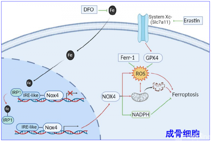 1、NOX4触发成骨细胞铁死亡可引起铁蓄积骨质疏松性骨质流失