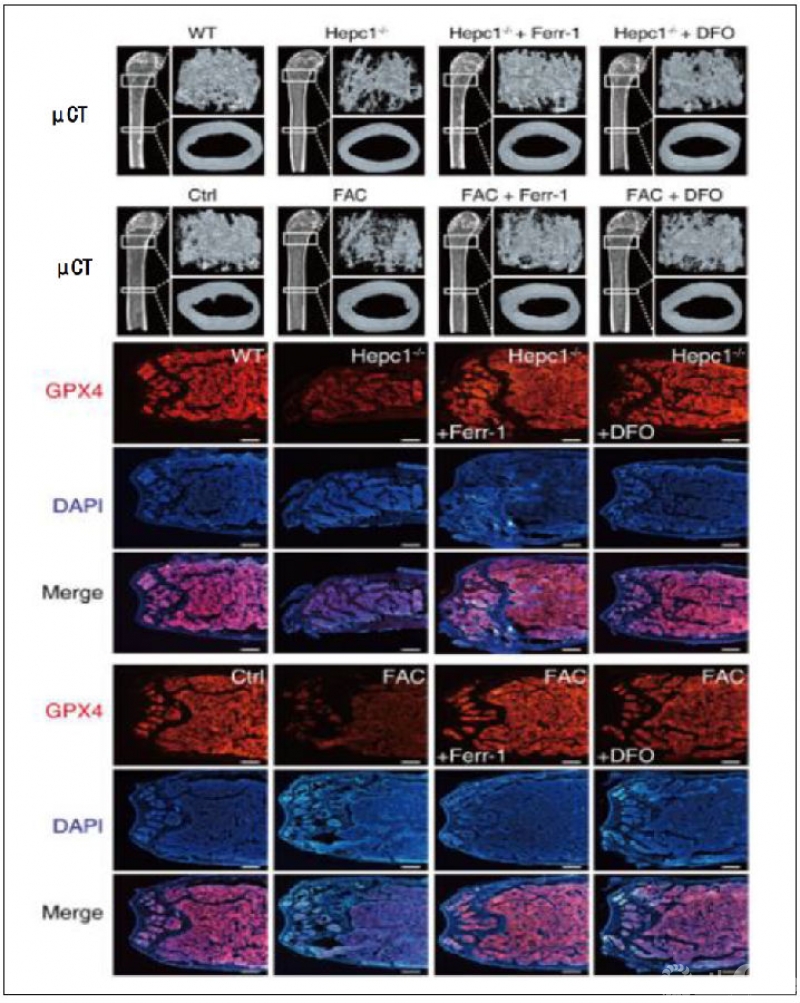 B、人体骨组织 μCT 及免疫荧光:铁蓄积与 GPX4 显著相关