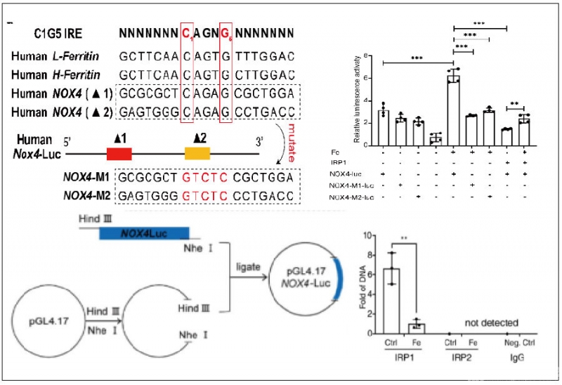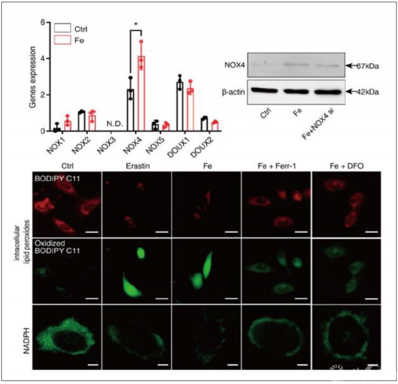 E、双荧光报告验证:铁蓄积可激活 NOX4 表达