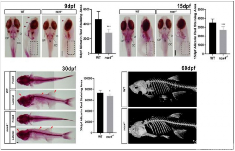 A、nox4-/-斑马鱼早期发育硬骨染色及 μCT