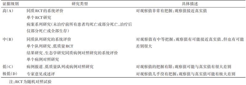 证据质量和推荐强度共识证据参考牛津循证医学中心证据分级,推荐意见强度参考推荐分级评估、制订与评价(GRADE)系统[13] 见表1,2。