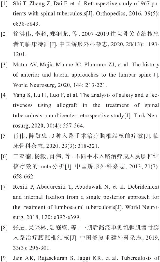 目前,普遍认为腰骶椎结核后路手术具有风险小、手术时间短、出血量小等优势,但仍有研究者选择前路手术进行腰骶椎结核的病灶清除。