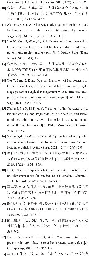此外,有研究提出前侧方入路治疗腰骶椎结核的另一种思路,即斜侧方椎间融合术(oblique lumbar interbody fusion, OLIF)。其在总住院时间、术中出血量、术后VAS评分等方面比单纯后路或前路更具优势[16]。但也有学者发现,OLIF手术在脊柱矫形方面的完成度较差,在骨破坏严重需要大角度矫正畸形的患者中几乎无用武之地,且经此入路实现内固定十分困难[17]。
