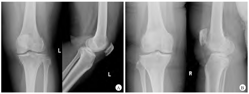 术后6周随访,患者双下肢可完全负重行走,右膝关节活动度0°~135°,左膝关节活动度0°~90°,左膝关节外翻试验(−),X线检查显示假体位置良好,膝关节外翻试验下进行X线检查,显示膝关节稳定(图3)。