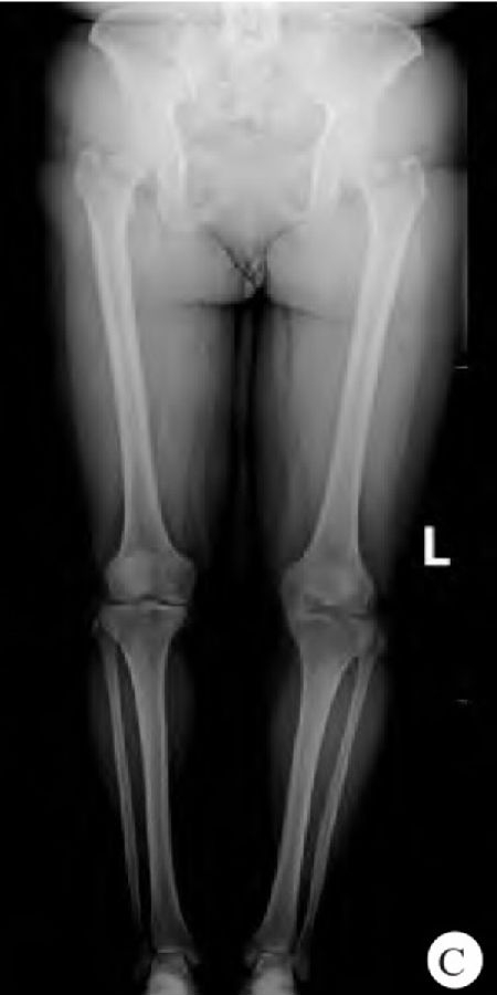 A. 左膝关节正、侧位X线片显示左膝关节内侧间隙明显减小;B. 右膝关节正、侧位X线片显示右膝关节内侧间隙明显减小;C. 双下肢全长正位X线片显示双膝关节内侧间隙明显减小,左膝内侧间室已骨对骨摩擦。