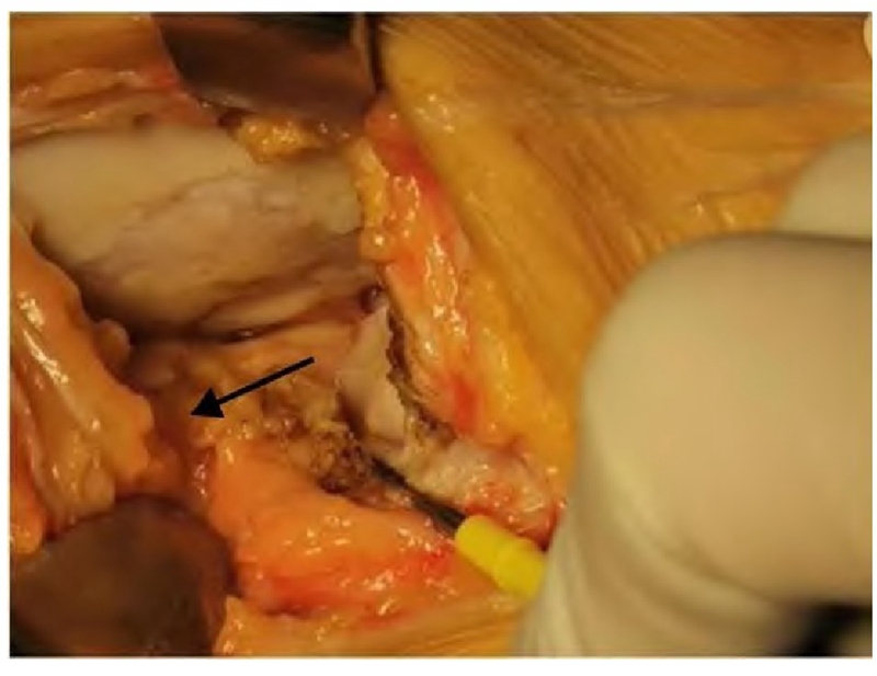 图2 术中损伤的内侧副韧带(箭头所示)