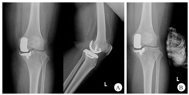 A. 左膝关节正、侧位X线片可见假体位置良好;B. 膝关节外翻试验下左膝关节正位X线片显示膝关节内侧间隙未过度张开,内侧副韧带功能正常。