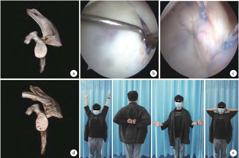 a. 术前CT 三维重建示关节盂无明显骨缺损;b. 术中关节镜下见关节盂前方明显Bankart 损伤;c. 关节镜下修复关节囊盂唇复合体;d. 术后1d CT三维重建示关节盂4枚锚钉位于2∶00~5∶30 区域;e. 术后6 个月患肩功能恢复良好
