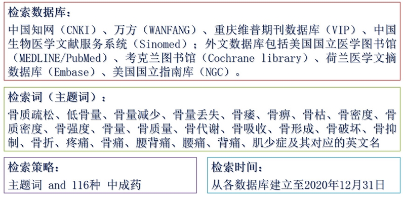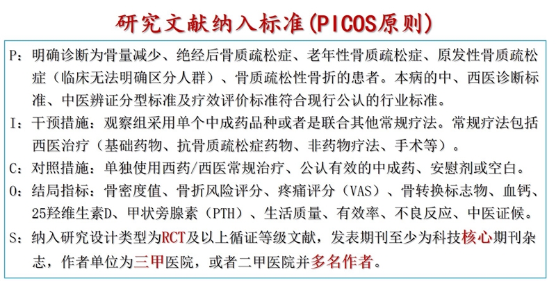 因此,由国家中医药管理局立项《中成药治疗优势病种临床应用指南》标准化项目,由中国中药协会负责实施,由上海中医药大学附属曙光医院和上海交通大学附属第六人民医院共同牵头,组织行业内中西医临床专家、指南研究方法学专家、药学专家成立中成药治疗OP 指南研究课题组,遵循“循证为主、共识为辅、经验为鉴”的原则,参考目前高质量临床证据,制定《中成药治疗骨质疏松症临床应用指南》,为临床医生合理、规范使用中成药提供参考和指导。