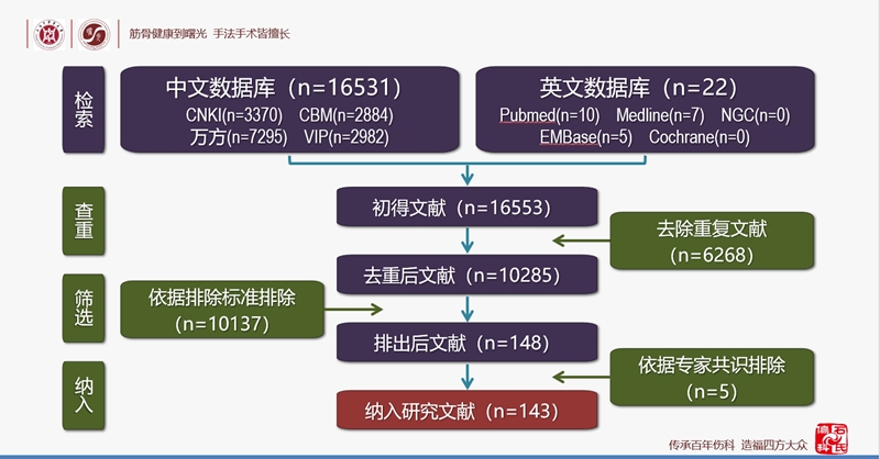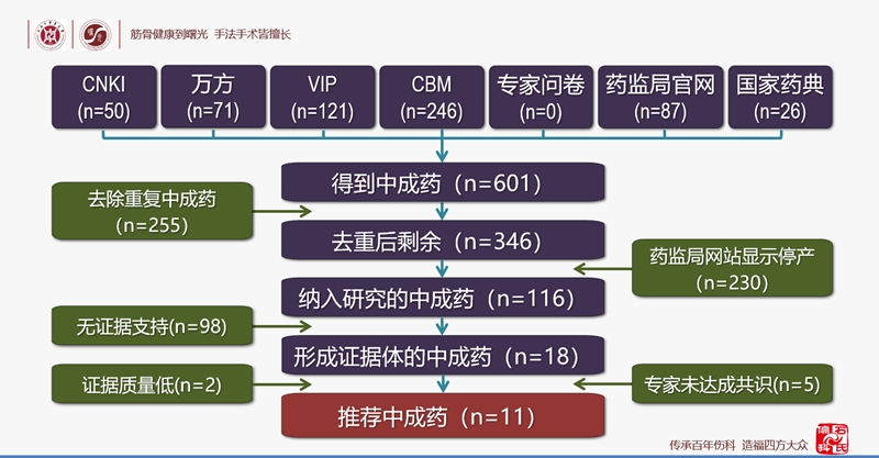 该指南以“循证为主、共识为辅、经验为鉴”为指导原则,通过文献研究归纳总结中成药治疗骨质疏松症的询证医学证据。共检索文献16533篇,经多次筛查,最终纳入符合纳入标准的研究文献143篇,涉及18种中成药,覆盖5种类型的骨质疏松症人群,经过评估风险后,按照GRADE方法评价证据的质量。期间共举办4次专家会议,1次专家电子问卷,1次普通人群的电子问卷,最终形成推荐意见。