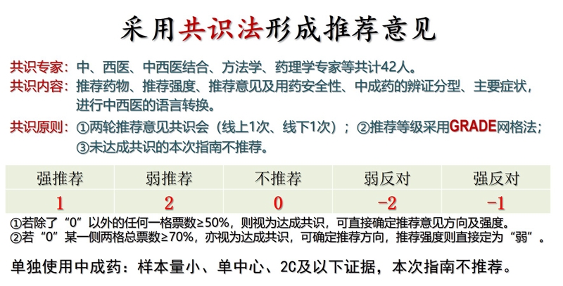 本部指南突破传统的思维模式,将OP 的不同类型和中医的辨证施治相结合,形成西医易懂能用的中成药治疗OP 的临床应用指南。通过专家共识确定了OP的五个人群,在每个人群下,确定了某一中成药的干预措施、比较因素和结局指标,最终形成了18条接地气的推荐意见和推荐强度等级。