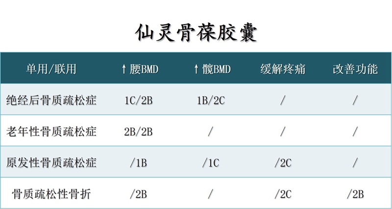 仙灵骨葆胶囊联合双膦酸盐12月,可升高腰椎骨密度值(1B),升高股骨颈骨密度值(1C),减轻疼痛VAS(2C)。