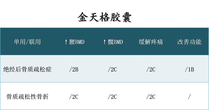 金天格胶囊联合双膦酸盐或活性维生素D 6月,可升高腰椎骨密度值(2B),升高股骨颈骨密度值(2C),降低P1NP(2C),降低β-CTX(2C),减轻疼痛VAS(2C),减少中医症状积分(1B)。