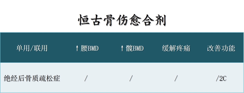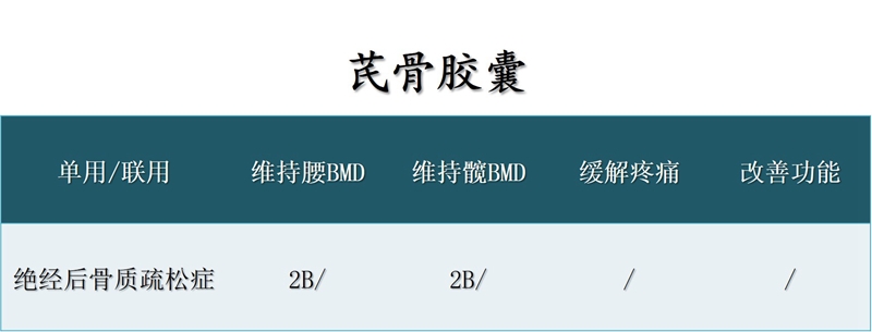 芪骨胶囊单独使用6月,可维持腰椎骨密度值,、维持股骨颈骨密度值(2B)。