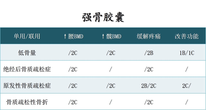 强骨胶囊联合活性维生素D 6月,可升高腰椎骨密度值(2C),升高总髋部骨密度值(2C),减少中医症状积分(1C);