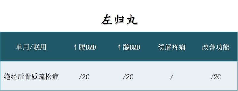 左归丸联合替勃龙+活性维生素D 6月,可升高腰椎骨密度值,升高股骨颈骨密度值,提高中医证候积分有效率(2C)。