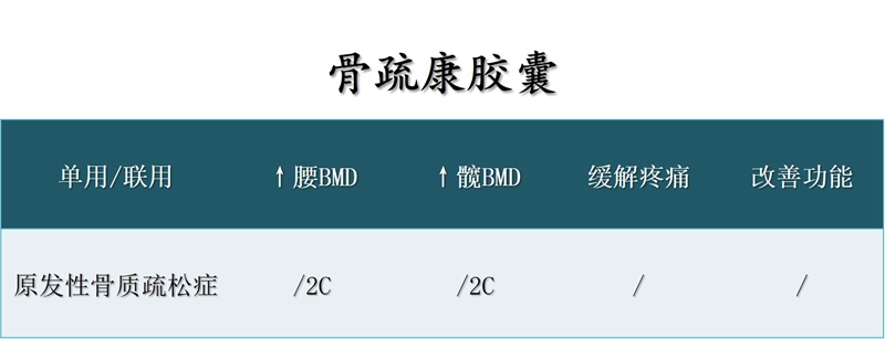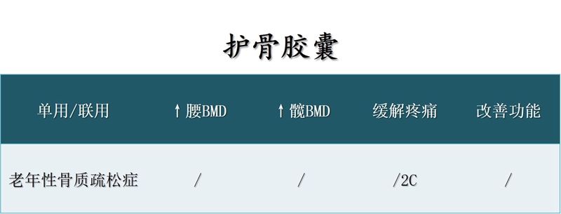 护骨胶囊联合活性维生素D 6月,可减轻腰背痛VAS(2C),但该药物缺少其他重要结局指标支持,样本量小,临床使用时需要根据实际情况选择。