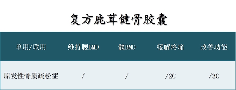 复方鹿茸健骨胶囊联合活性维生素D 6月,可减轻疼痛VAS,提高生活质量,减少中医症状积分(2C)。