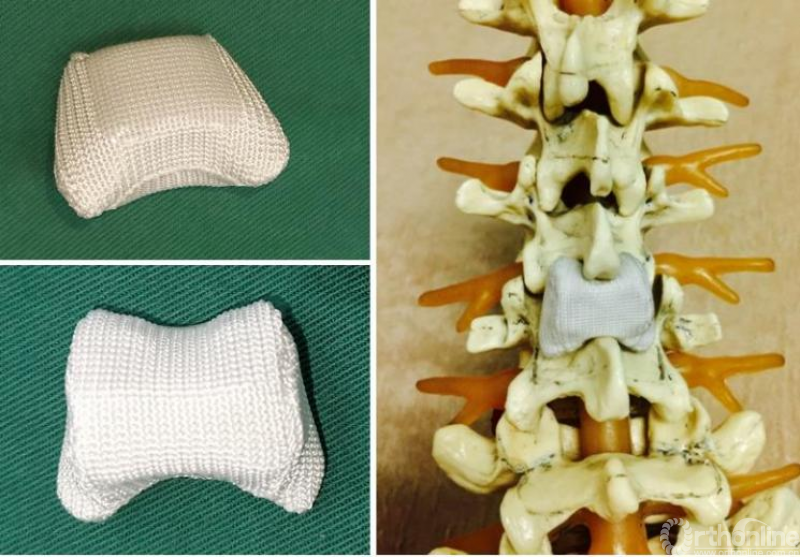 IntraSPINE装置(图2,图3D)内部为中空设计,材料为医用硅,外部包裹聚酯纤维材料。后段在器械的作用下可以被压缩植入,在移除器械后恢复原状,方便手术操作。手术时插入至椎板间隙起到撑开作用,可以一定程度,并且由于其具有一定弹性,手术节段的活动度可以得到保留。