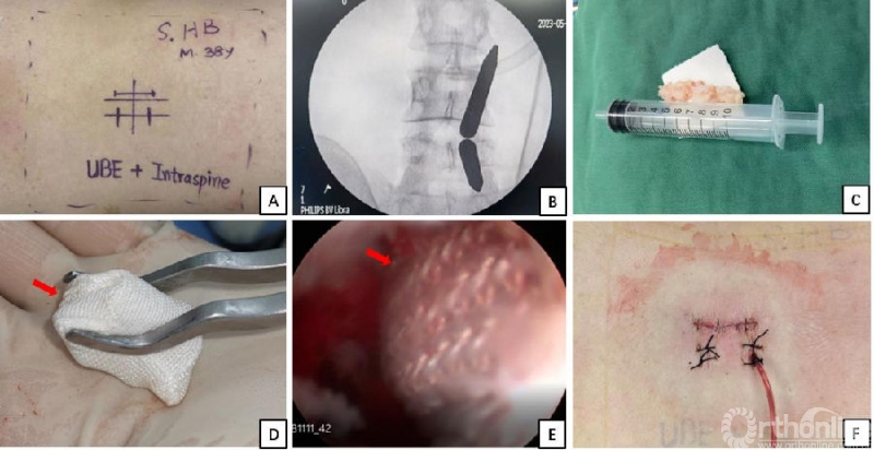 【A:术前切口设计;B:建立右侧UBE通道;C:镜下切除的脱出髓核组织;D:IntraSPINE装置(体外);E:镜下IntraSPINE装置(体内);F;术后伤口】