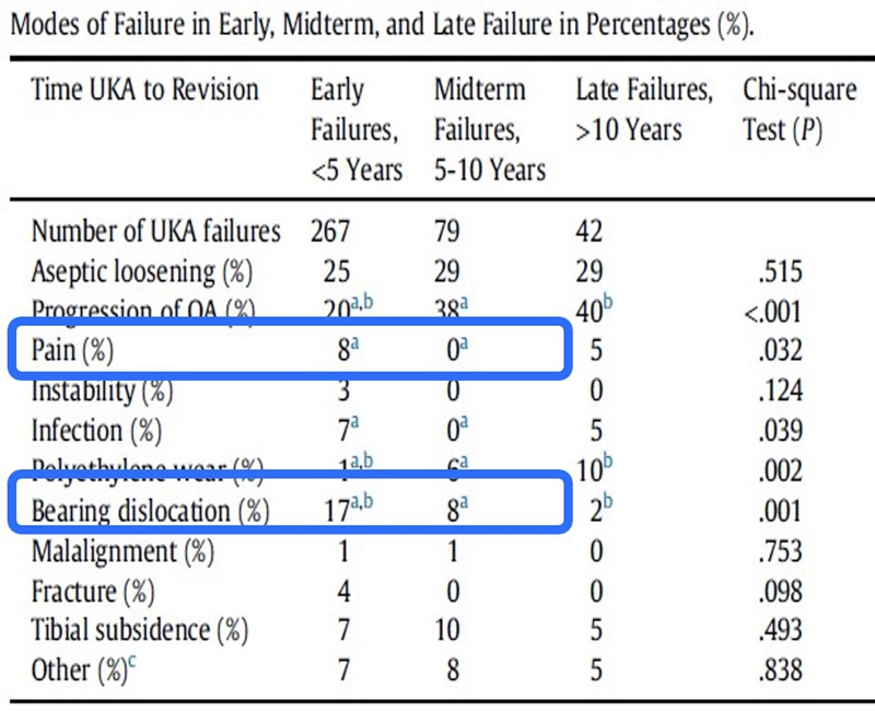 引起UKA失败的原因包括感染、疼痛、垫片脱位、假体周围骨折、无菌性松动、对侧间室关节炎等,其中主要原因为垫片脱位和疼痛。