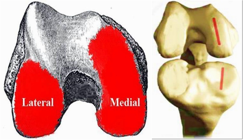 (2)股骨髁解剖轴并不前后平行,且股骨内髁解剖变异大。